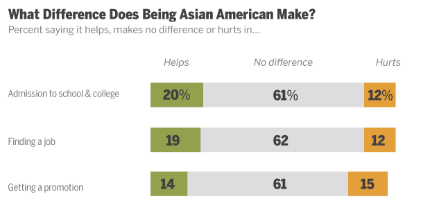 11)作为亚裔,你认为对你上大学,找工作和升职上是有好处还是有坏的影响? 60% 多一点的人认为没有任何影响。
