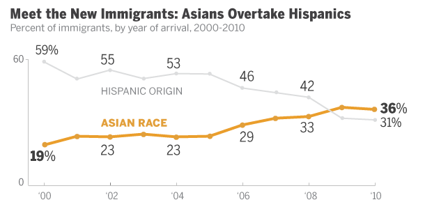 与此同时,来自亚洲的移民数量开始增多,尤其是来自中国和印度的人热衷于到美国求学或者在高科技行业工作等。尽管亚洲移民的数量在不断增加,但是目前西班牙裔移民仍占美国人口的很大一部分。