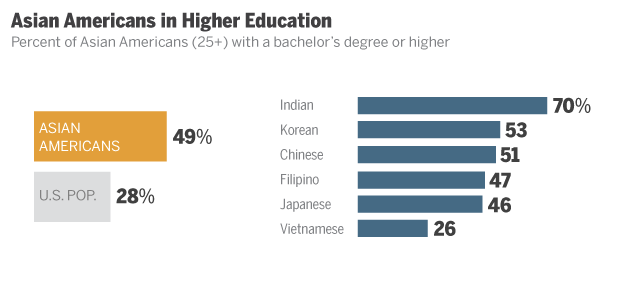 5)从教育程度上说,25岁以上有本科及以上学位的亚裔占到49%, 而美国整体水平只有28%,而印度人有本科以上学位的占到70%。