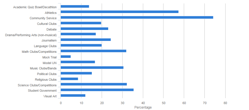 当然,这些学生绝不可能甘心做“书呆子”,他们在高中阶段参与了很多丰富的活动,其中“社区服务”(74.2%)和“参与运动”(57.3%)高居榜首,受到绝大多数学生的欢迎。