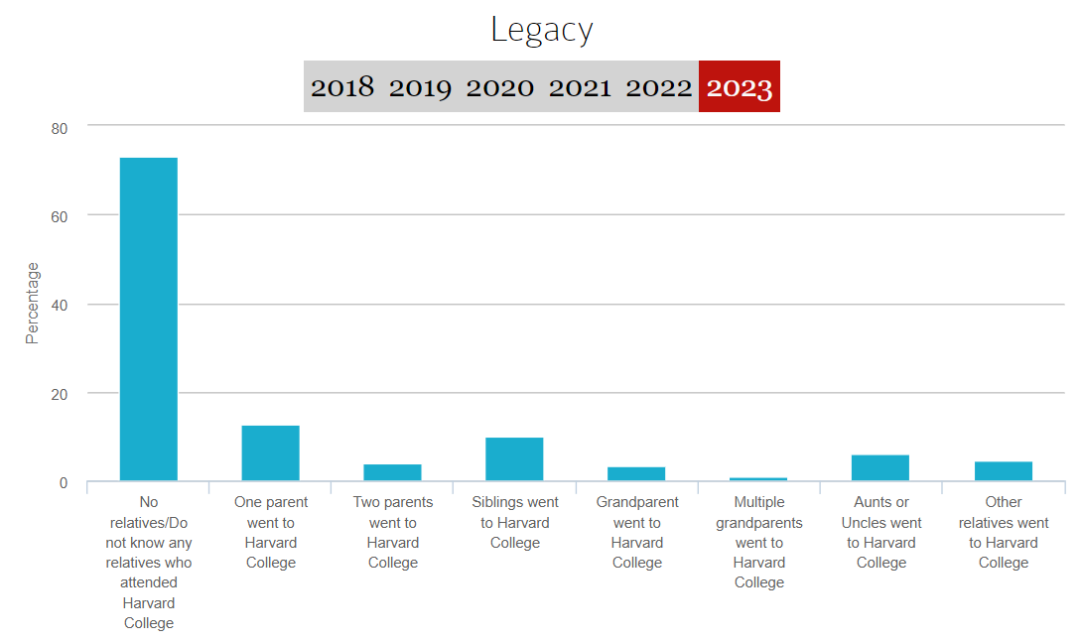 首先,在族裔组成方面,我们可以清晰地看到,在 2023 级哈佛新生中,白人和亚裔的比例与去年相比都有所增加,白人占 47.2%,亚裔占 22.6%,两者相加基本占据了全体新生的70%。