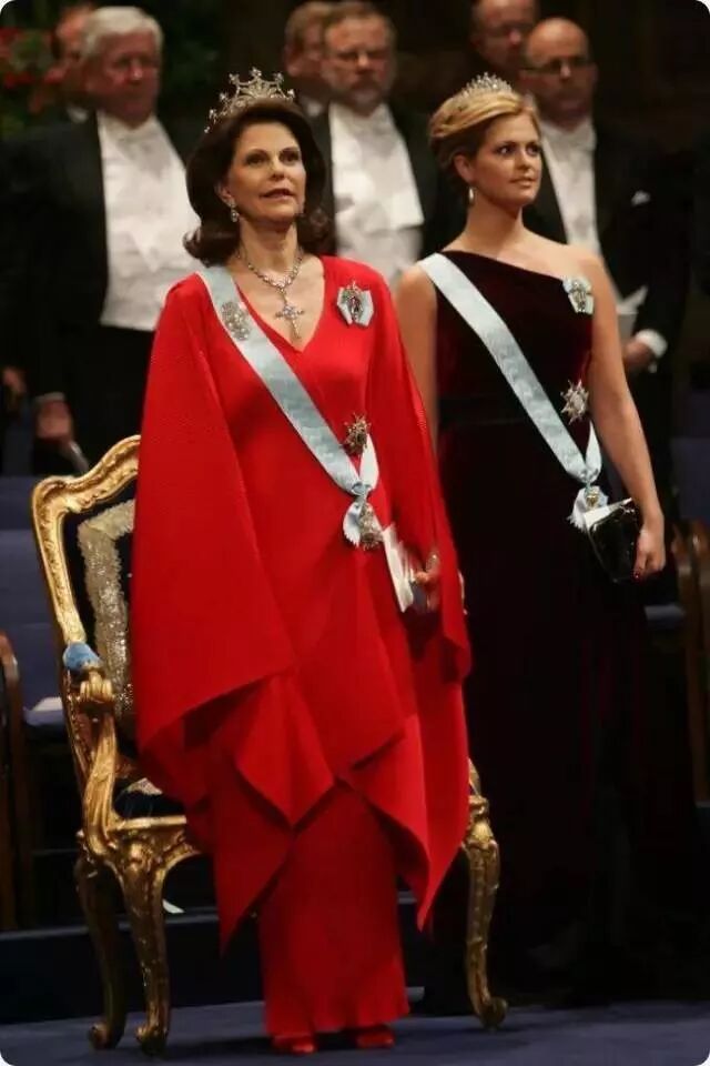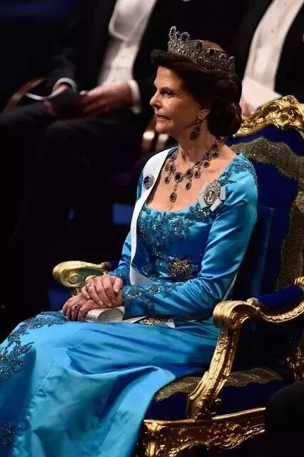 比如2015年,西尔维亚在她的第40次诺奖晚宴上,选择了一身颜色热烈而样式保守的礼服。