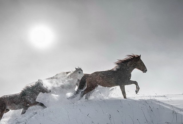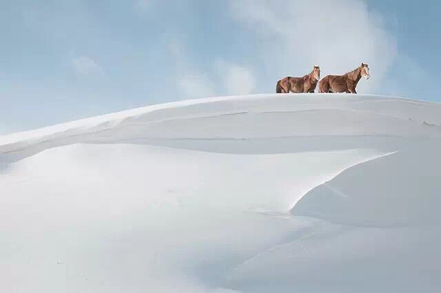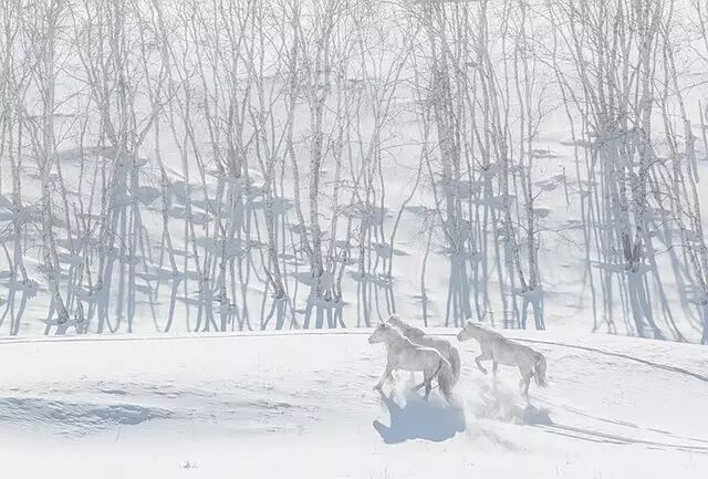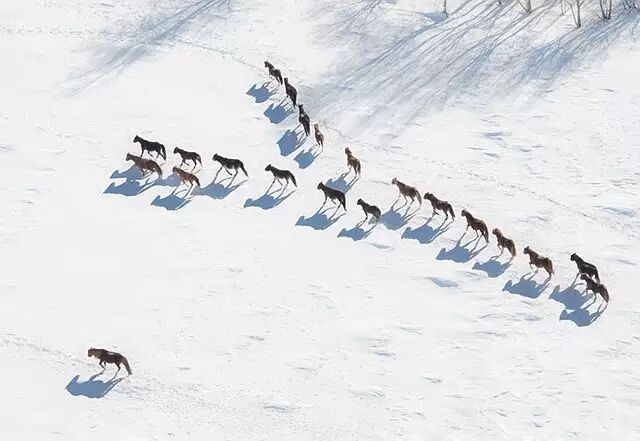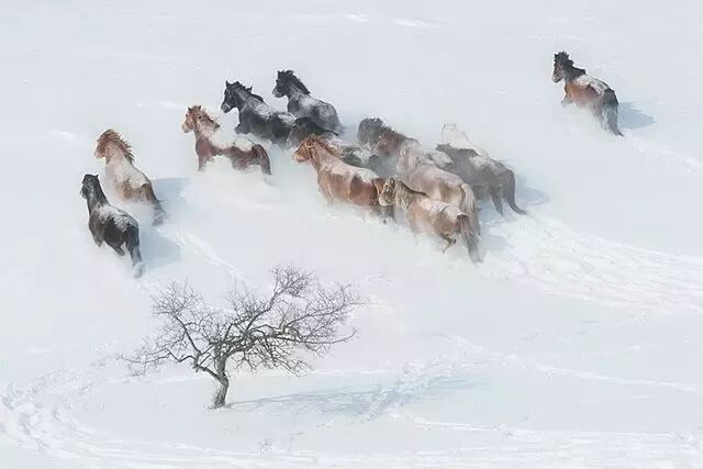 雄悍的的蒙古马为雪原增也添了生机,天地、马之间达到了原始的和谐。