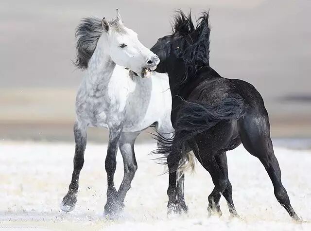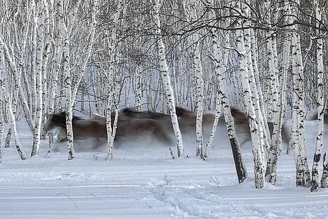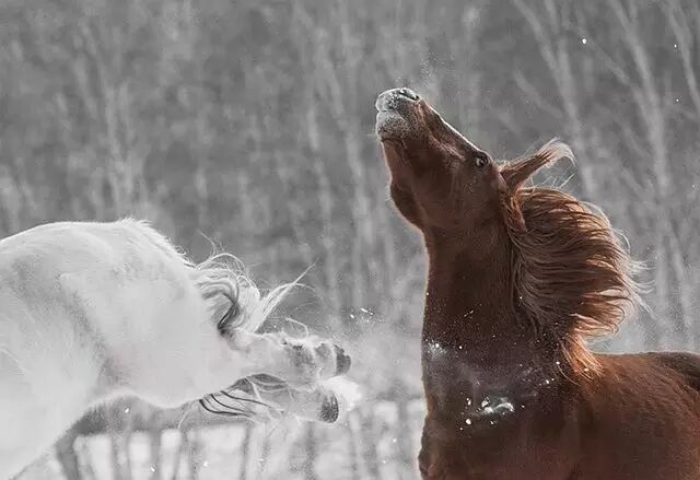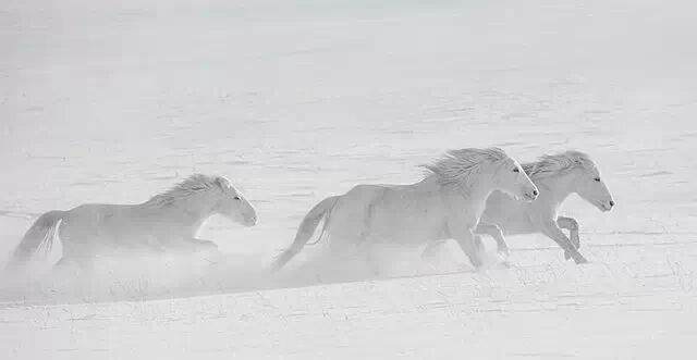 在风平雪静之时,马相互追逐,奔腾嘶叫,释放激情,显示了生命的力量、速度和气势。