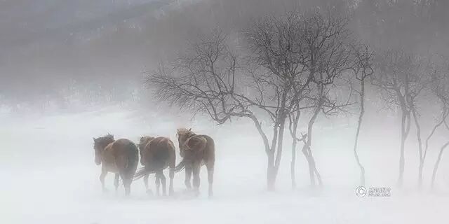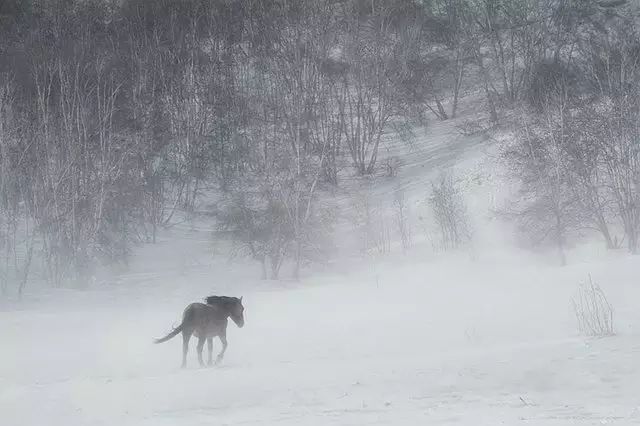 风起雪涌之时,天地一色,马在艰难地行走和顾盼,构成了诗一样的意境。