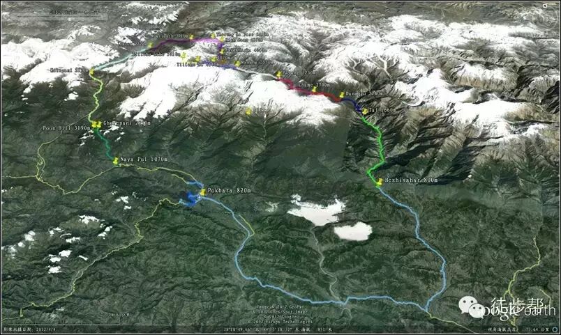 说明:坐车包括中途在Syange吃午饭时间。徒步有点慢,一直在等背夫。难度定为四级是后面有一段座车非常危险,很多人都不敢往下看,还不时有人发出尖叫。今天的风景主要是低海拔峽谷风光,最大的亮点是在车上看到Manaslu,但也有当地人说我们看见的是另一座七千米雪山,这个有待专家考证。