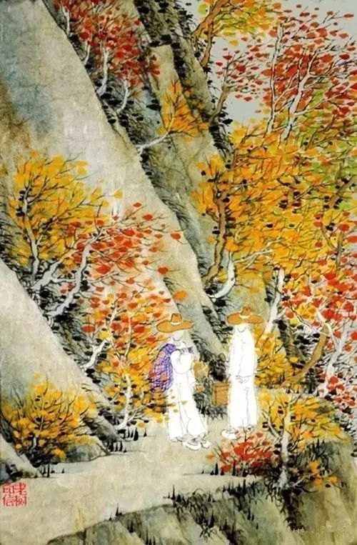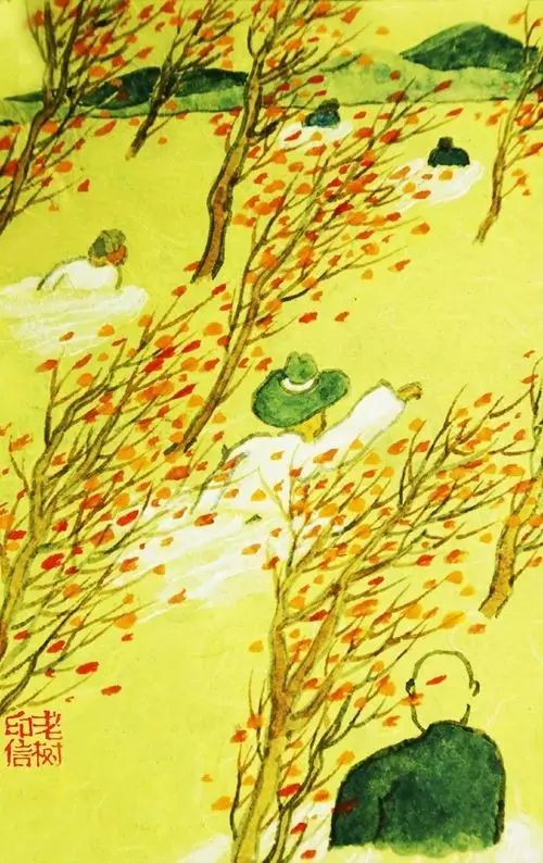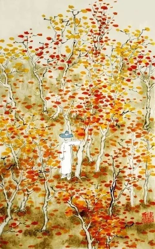 晚暮霜重风愈凉,,山前树叶红兼黄。