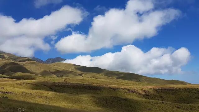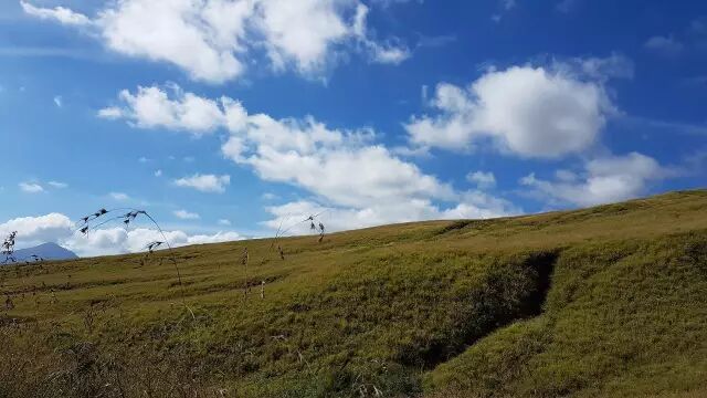 一路上清澈的蓝天白云和鹅黄色的高山草甸