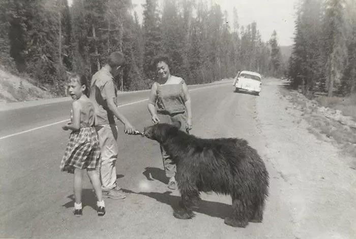 我爸正给一只口渴的熊喂苏打水。
