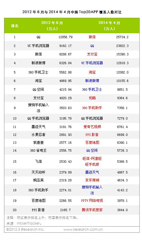 先说覆盖人数最多的前五款产品,在2012年8月,分别是QQ、UC手机浏览器、微信、新浪微博和360手机卫士,而到今年的4月,前五位则更改为微信、QQ、支付宝、UC手机浏览器和淘宝。