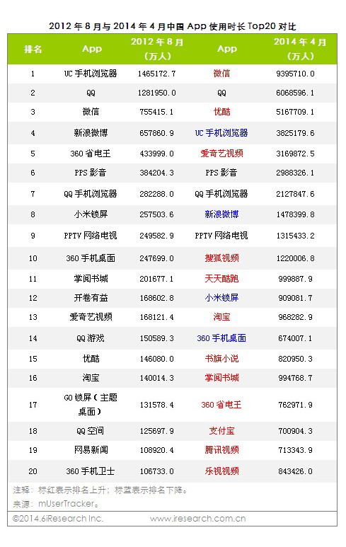 我们再来看使用时长的前二十位产品。在2012年8月,排名前三位的都是腾讯的产品,分别是UC手机浏览器、QQ和微信,而到今年4月,排名更改为微信、QQ和优酷。