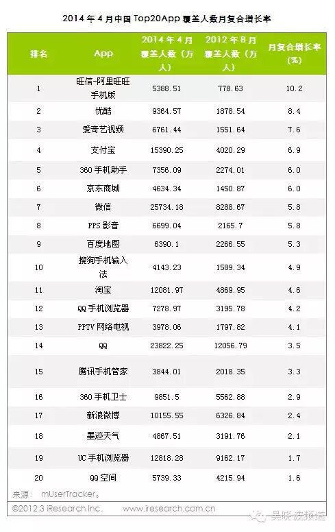 艾瑞市场咨询(iResearch)提供了一组过去二十个月——即2012年8月到今年4月的数据给我,包括:排名前20位APP产品的使用时长、覆盖人数及覆盖人数月复合增长率。由此,我们得以一窥真实的手机世界。