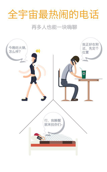 一块-超级电话最大的特点还在于多人的同时沟通场景,目前可以支持20人的群组,未来还会支持多人互动,无限制模式的直播收听,通过多方的模型,彻底颠覆传统的电话网络,让人们生活更加有趣,人们的沟通更加丰富。