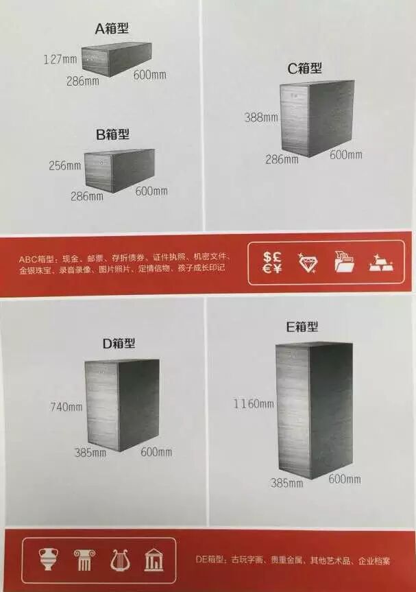 ABC三种相对较小的保管箱,可以存放现金、股票、存折债券、机密文件、金银珠宝、录音录像、图片照片、定情信物、孩子成长印记等。