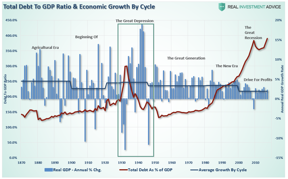 The economic drag from such a reduction would be a devastating process which is why Central Banks worldwide are terrified of such a reversion. In fact, the last time such a reversion occurred the period was known as the “Great Depression.”